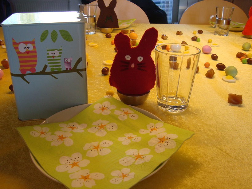 Påskeharen havde været på spil med en lille påskegave - tak :D Bordet var dækket med lækkert slik og de fine æggeskjulere, jeg har lavet i omkring 4.-5. klasse, hø hø.